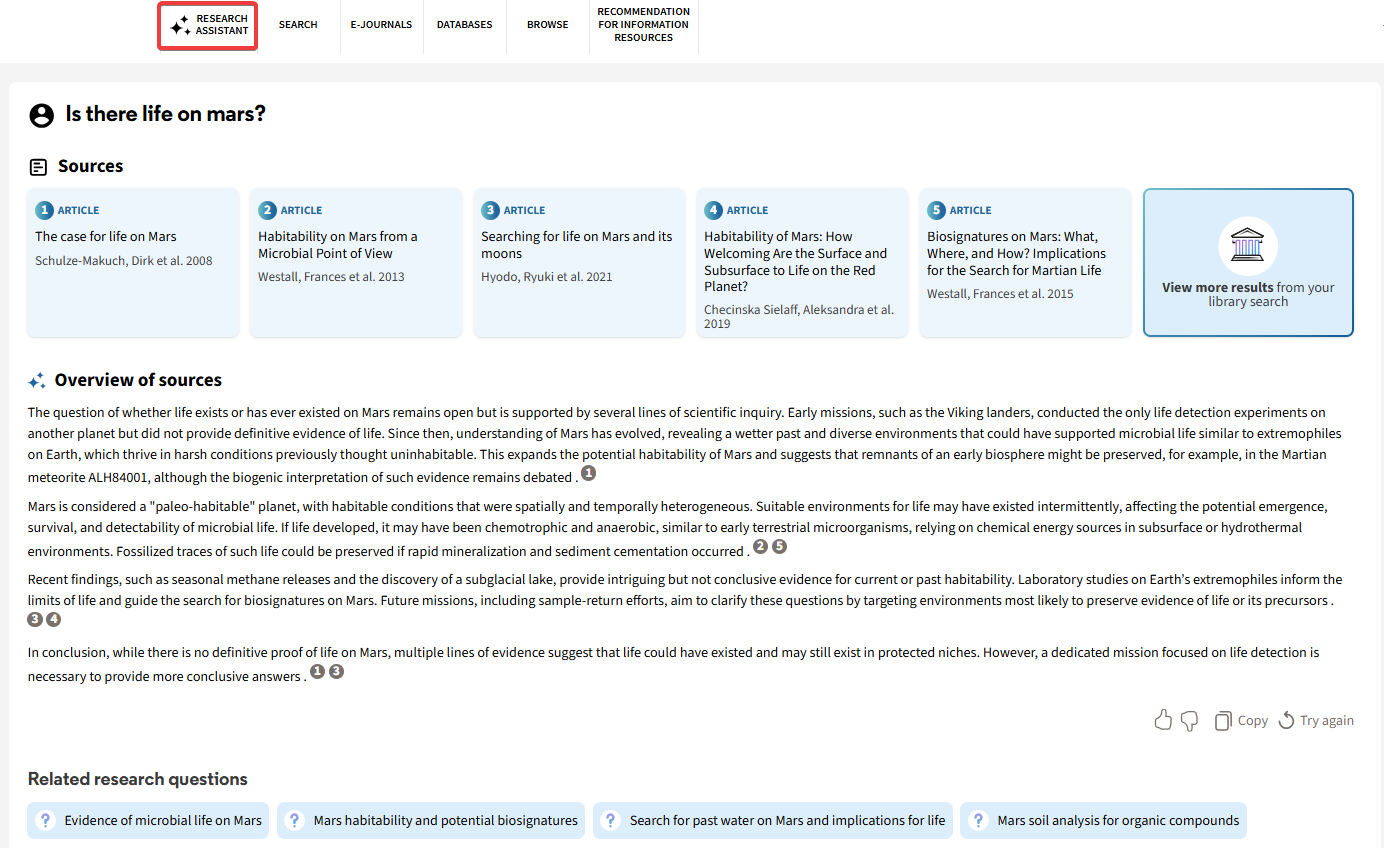 As shown in the image below, when you search for "Is there life on Mars?" you will encounter preliminary information prepared using the resources available in the Information Center.